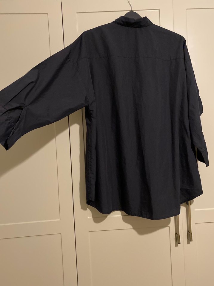Yüksek yakalı, uzun kollu, düğmeli siyah oversize gömlek. Salaş kesim