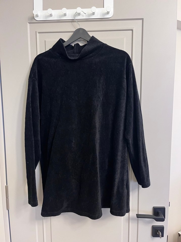 Siyah, yüksek yakalı, uzun kollu Yumuşak ve sıcak kumaştan, bol kesim ve midi boyda, günlük rahat kullanıma uygundur.