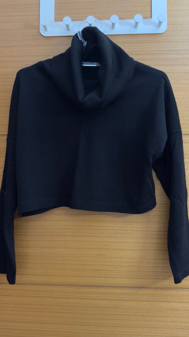 Yüksek yakalı ve uzun kollu siyah kadın kazak, Rahat kesimi ve mini boyu ile günlük kullanıma uygundur.