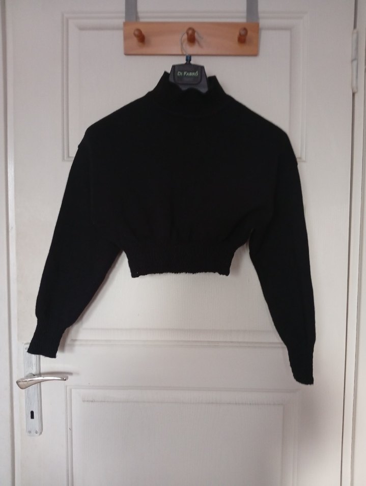 Fitted kesim, yüksek yakalı ve uzun kollu siyah kısa triko kazak, günlük kullanıma uygun şık ve sade bir parça.