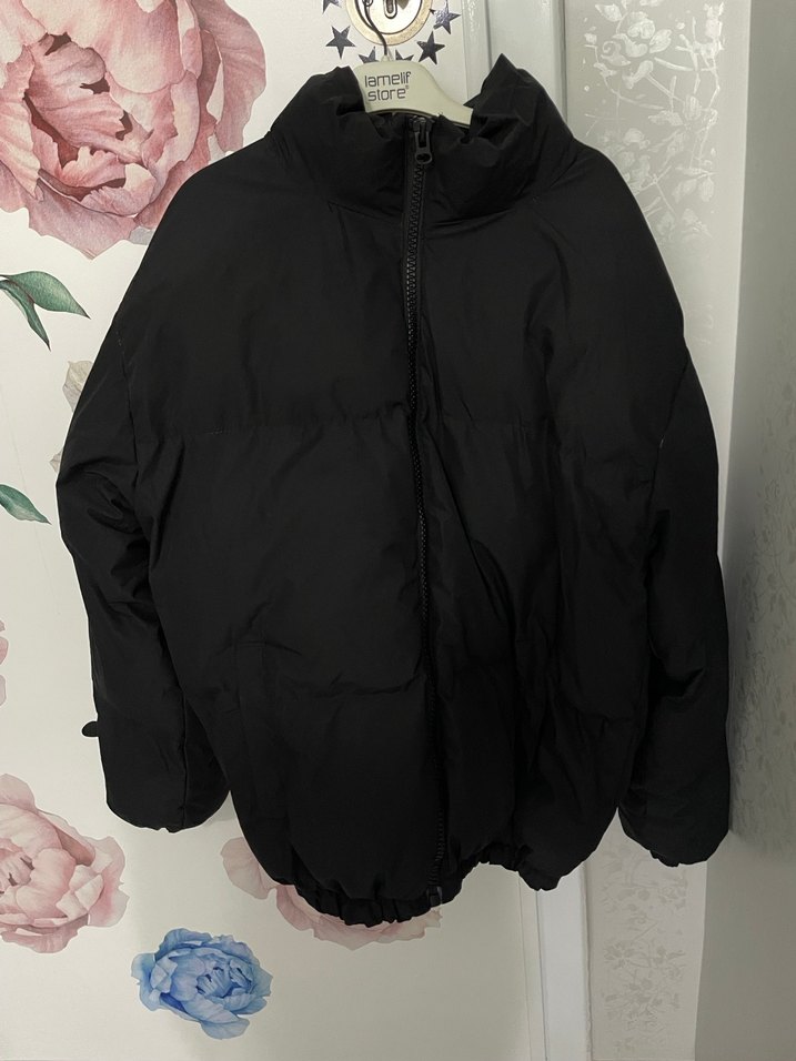 Yüksek yakalı, fermuarlı siyah kadın mont. Uzun kollu, bol kesim ve normal midi boyda, yumuşak ve sıcak kumaştan. Günlük sokak stili için uygun.