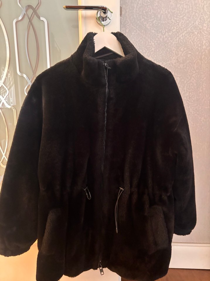 Siyah yüksek yakalı peluş mont, uzun kollu ve bol kesimdir. Yumuşak fleece kumaştan yapılmış, midi boyda ve günlük kullanıma uygundur.