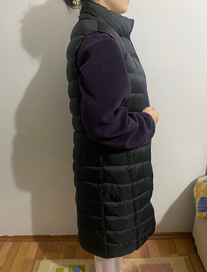 Siyah, yüksek yakalı, kürklü detaylı kadın şişme yelek. Yumuşak ve sıcak kumaştan, kolsuz ve dar kesim, günlük sokak stili için uygun.