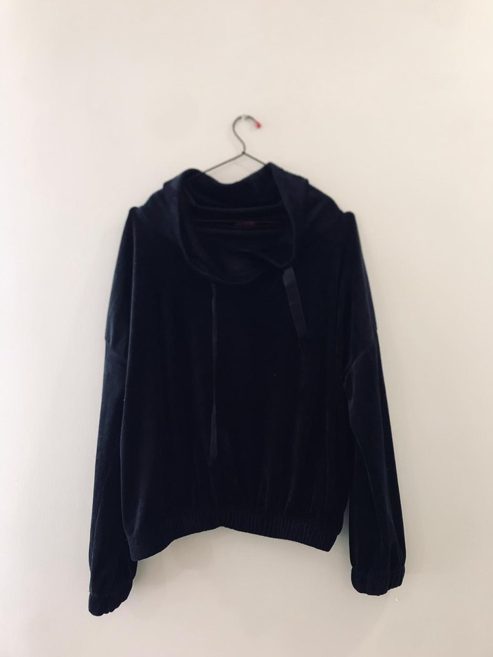 Siyah renkli, yüksek yakalı ve uzun kollu, bol kesim sweatshirt. Yumuşak ve sıcak kumaştan, drapeli tasarımlı ve midi boyda, günlük kullanıma uygun.