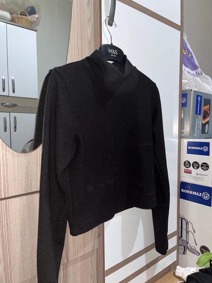 Siyah, yüksek yakalı, uzun kollu kadın sweatshirtü, yumuşak ve sıcak kumaştan yapılmıştır. Günlük kullanım için rahat ve şık bir tarz sunar, desensizdir. Üzerinde 'KORKMAZC' yazısı bulunmaktadır.