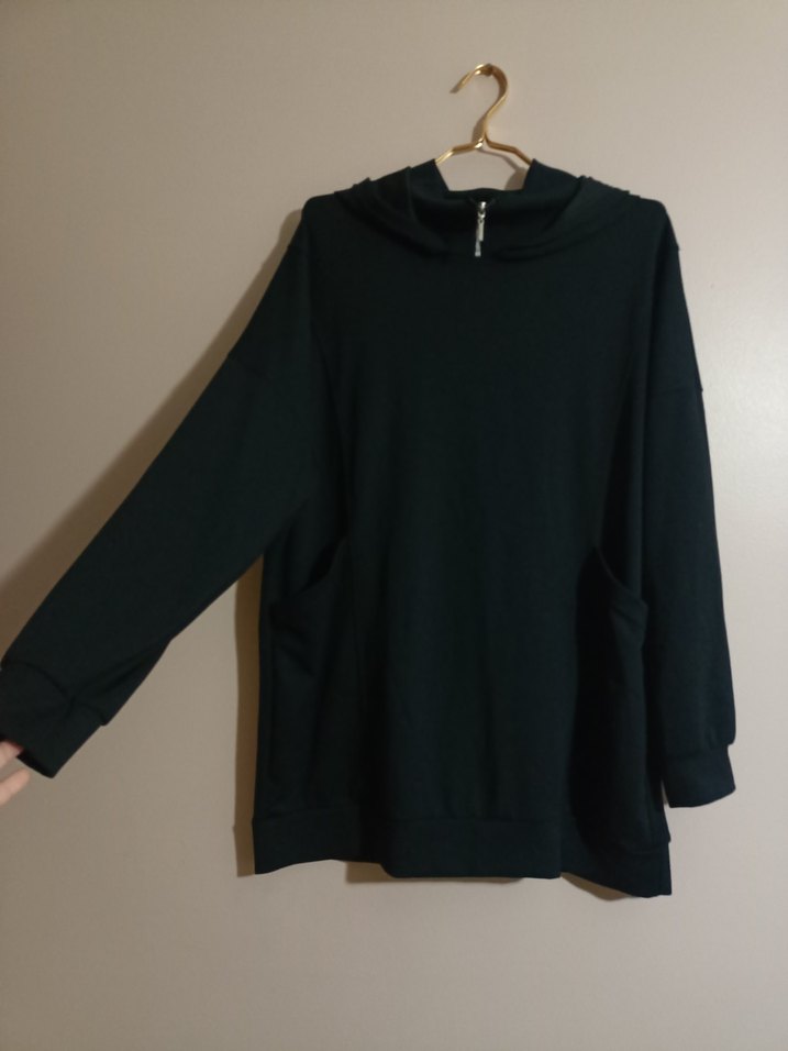 Yumuşak fleece kumaştan, yüksek yakalı ve uzun kollu, siyah, bol kesim kadın sweatshirt. Normal midi uzunlukta, günlük rahat kullanıma uygun sokak tarzı.