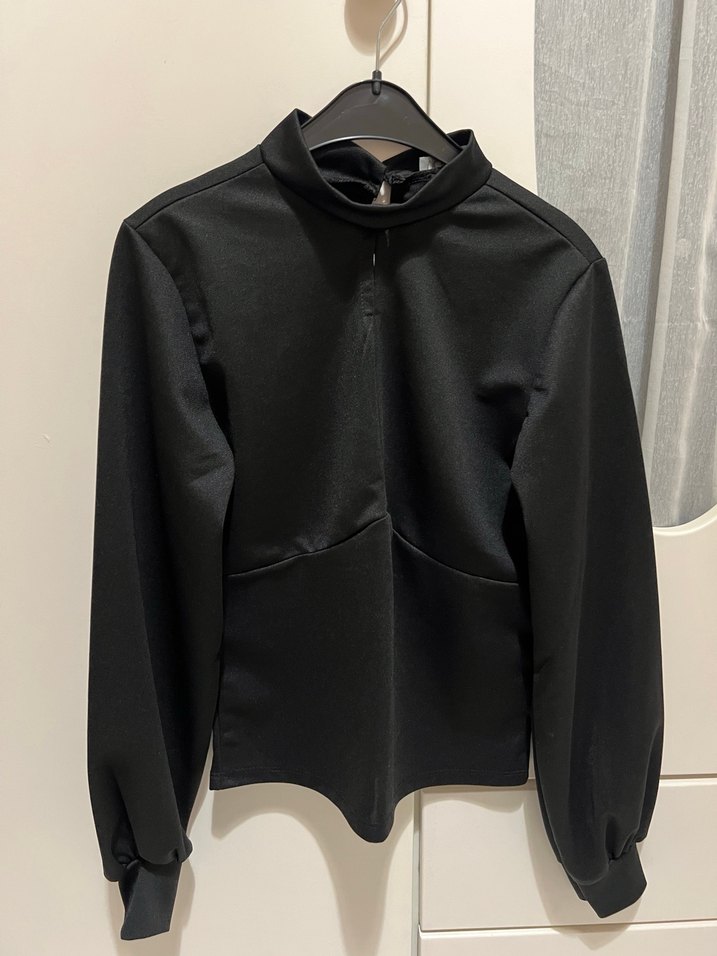 Siyah, yüksek yakalı ve uzun kollu, yumuşak ve sıcak kumaştan yapılmış dar kesim sweatshirt. Ofis ve günlük kullanım için uygun şık tasarım.