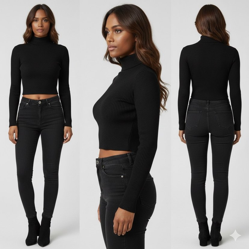 Yüksek yakalı, uzun kollu ve vücuda oturan siyah kadın triko. Minimalist ve goth tarzıyla günlük kullanıma uygun, midi boyda, şık ve rahat bir parça. Göğüs: 89 Cm. Bel: 71 Cm. Boy: 40'5 Cm. Kendi etiket kartımla gelicektir. Marka: Bergos Fashion.