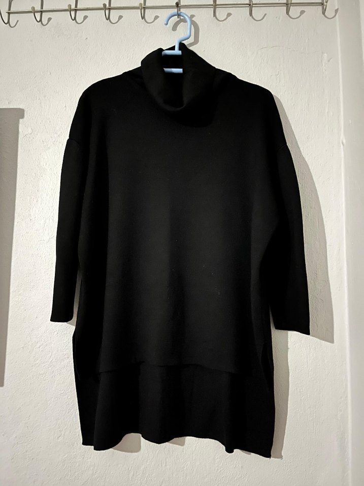 Yüksek yakalı, uzun kollu siyah kadın trikosudur. Rahat kesimi ve yumuşak, sıcak kumaşıyla gündelik kullanıma uygundur.