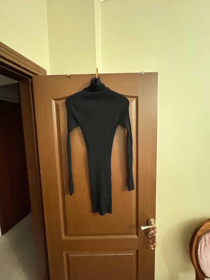 Yüksek yakalı, uzun kollu ve vücuda oturan siyah triko elbise, yumuşak sentetik kumaştan üretilmiştir. Minimalist ve gotik tarzıyla günlük kullanıma uygundur.