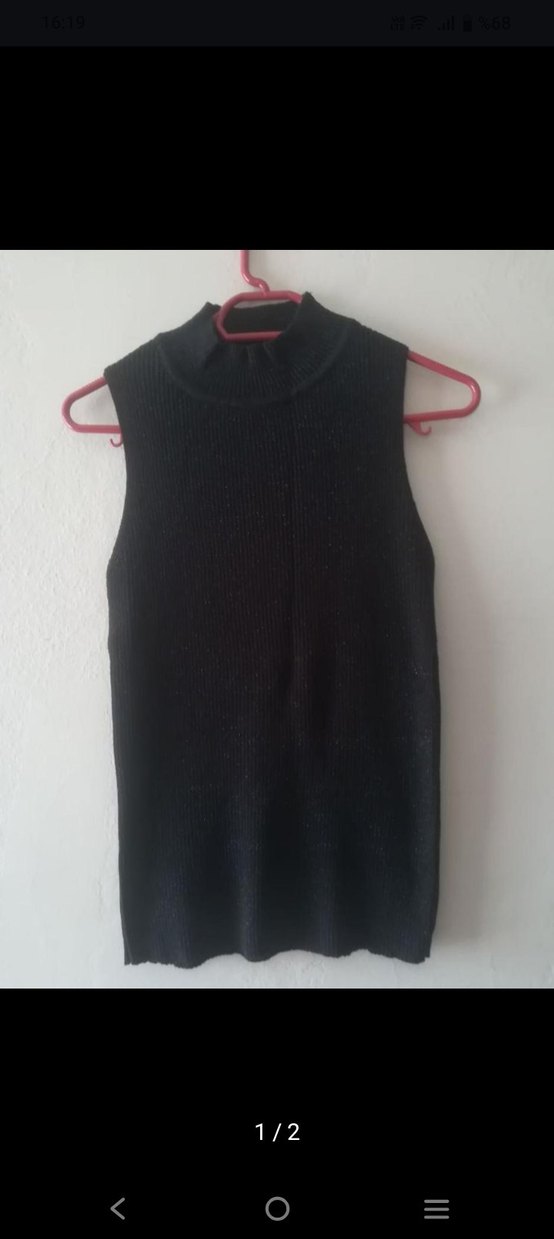 Siyah, yüksek yakalı,kendinden hafif simli, kolsuz ve midi boyda triko süveter. Yumuşak sentetik kumaştan üretilmiş, günlük rahat sokak stili için uygundur. boyu omuzdan etek ucuna 90 cm