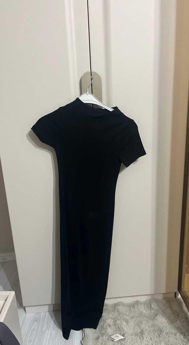Siyah uzun elbise, yüksek yakalı ve kısa kollu, vücuda oturan kesime sahip, pürüzsüz sentetik kumaştan üretilmiştir. Minimalist gotik tarzıyla günlük kullanıma uygundur.