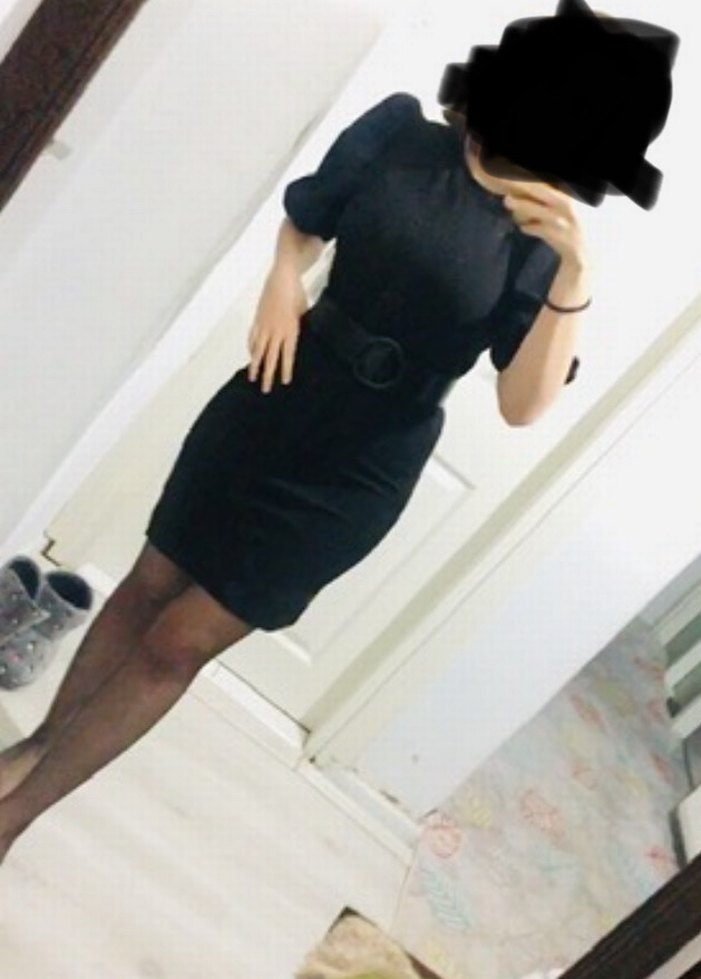 Siyah kalem elbise, yüksek yakalı. Midi boy ve sentetik kumaştan, ofis için uygun.
