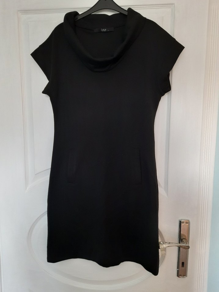 Düz siyah, kısa kollu, yüksek yakalı, vücuda oturan midi elbise. Pürüzsüz sentetik kumaştan, rahat ve şık günlük kullanım için uygun. cepli.