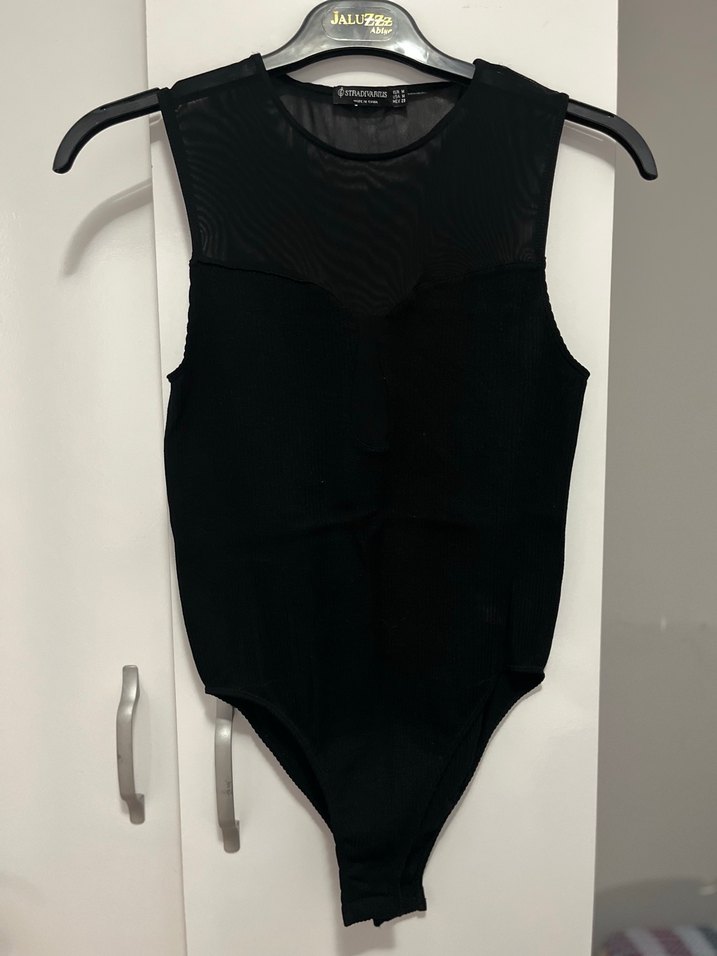Kolsuz, yüksek yakalı,transparan,siyah ve vücuda oturan bodysuit.