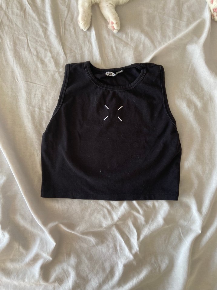 Yüksek yakalı, kolsuz ve fitted kesime sahip siyah crop top, yumuşak keten kumaştan üretilmiştir. Günlük kullanıma uygun sade tasarımlıdır.
