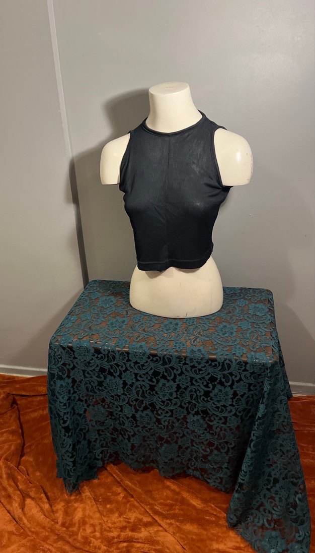 Siyah, kolsuz, yüksek yakalı ve kısa kesim olan bu crop top, düz ve rahat sentetik kumaştan üretilmiştir. Günlük kullanıma uygun şık goth tarzı bir parça. Jarse kumaştan ,çok şık S ve M bedene uygundur