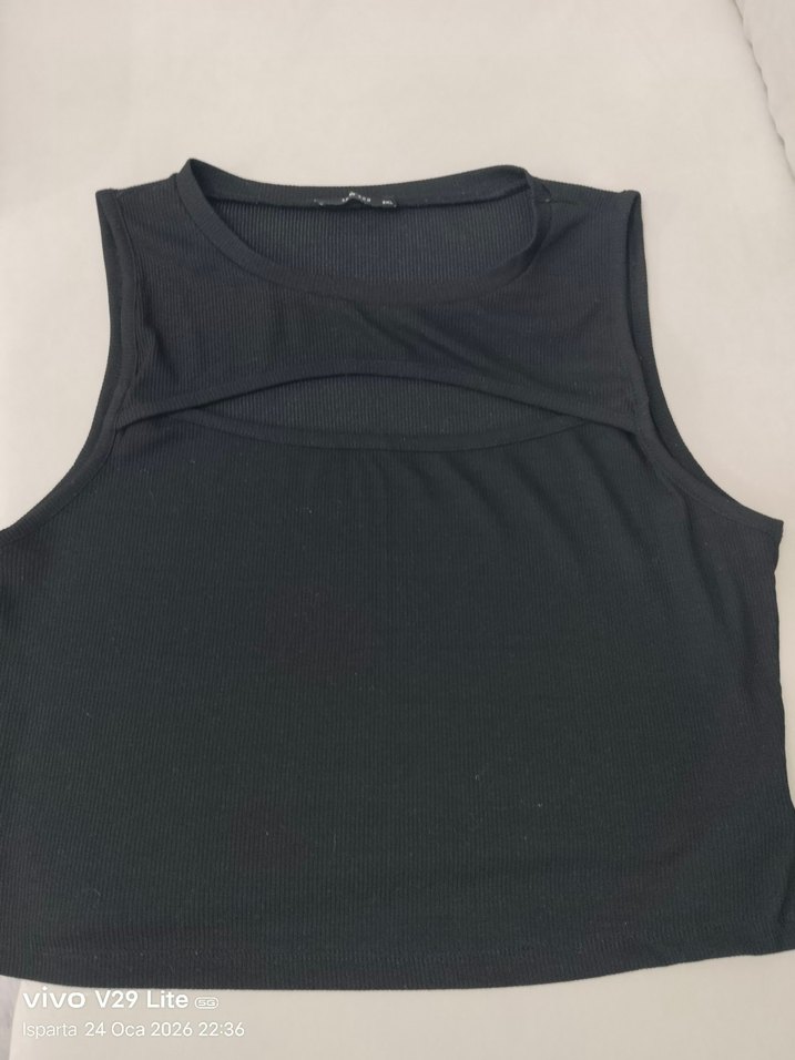 Siyah, kolsuz, yüksek yakalı crop top. İnce kesim ve yumuşak sentetik kumaşla rahat bir görünüm sunar.