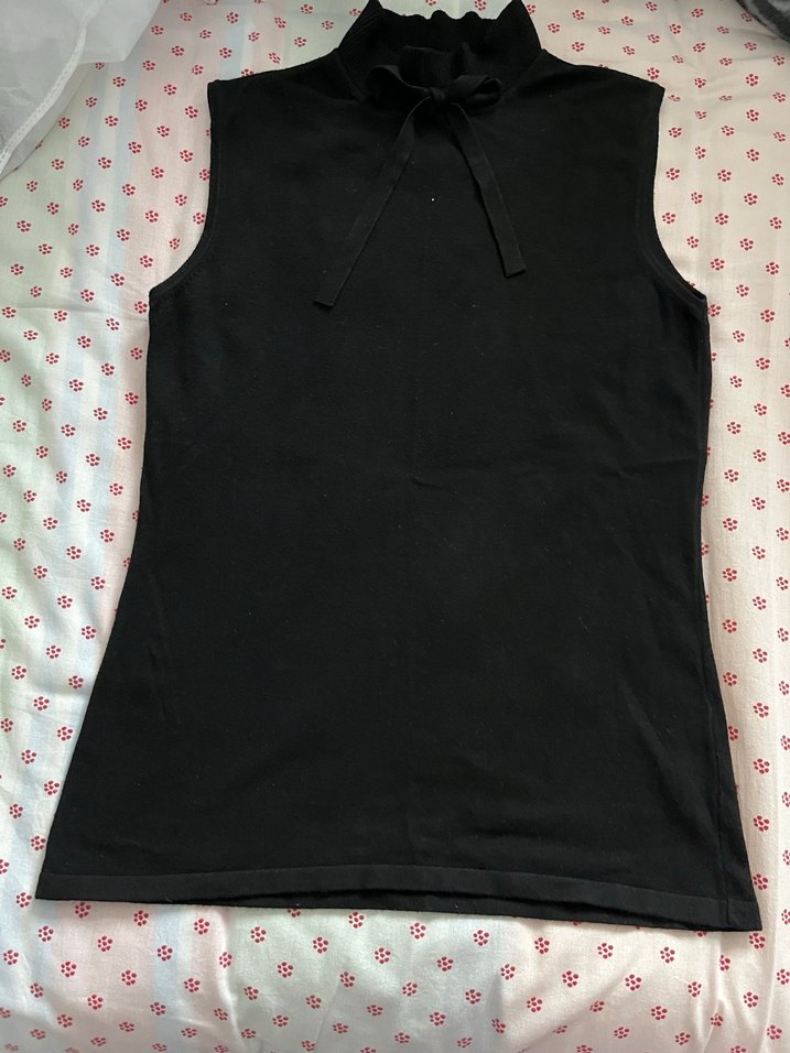 Siyah kolsuz kadın bluz, yüksek yakalı ve bağlama detaylıdır. Sentetik kumaştan, midi boyda ve vücuda oturan kesime sahiptir. Minimalist ve gotik tarzda, günlük kullanıma uygundur.