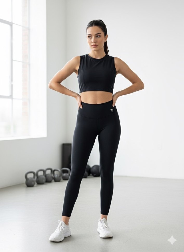 Siyah kolsuz kadın spor üstü, yüksek yakalı ve vücuda oturan kesime sahiptir. Sentetik kumaştan, normal midi uzunlukta ve desensizdir, trend sokak stili için uygundur. İhraç fazlası sıfır üründür Kolaltı 38 Boy 35cm