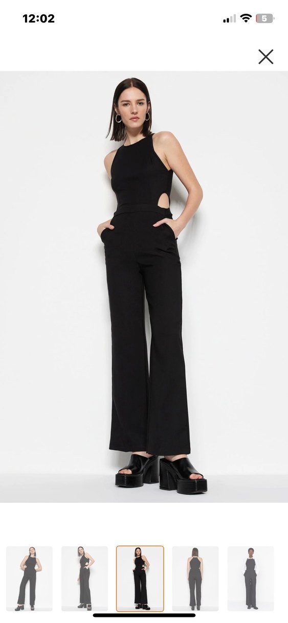 Pek belli olmayan renk farklılıkları var . Siyah, yüksek yakalı ve kolsuz bu dar kesim tulum yanlarda yırtmaç detayına sahip, minimalist ve modern bir ofis tarzı sunar.