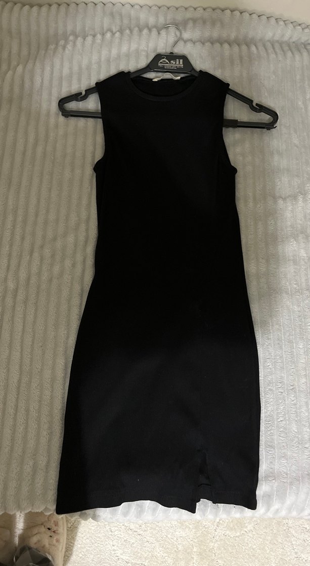Siyah, kolsuz, yüksek yakalı ve vücuda oturan midi elbise. Düz ve sentetik kumaştan, minimalist ve goth tarzda, ofis kullanımı için uygun.