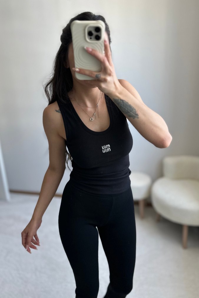 Pamuk kumaştan, yüksek yakalı ve kolsuz, siyah mini atlet. Spor ve sokak stiline uygun, rahat ve şık tasarım.