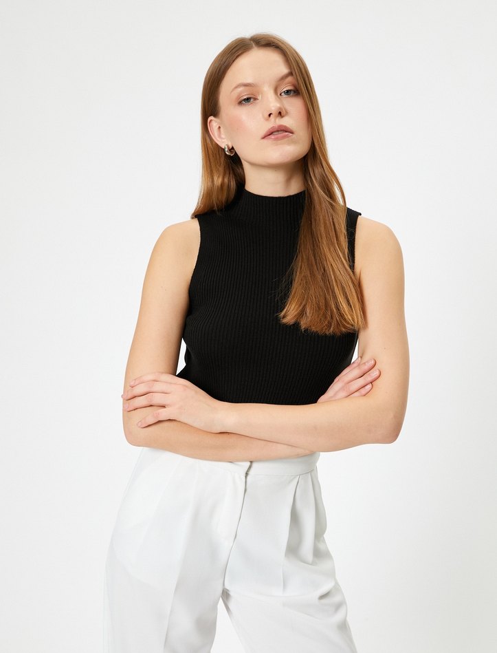 Siyah Yüksek Yakalı Kolsuz Mini Bluz