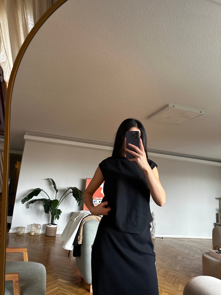 Siyah, kolsuz. Eteği asimetrik kesim.