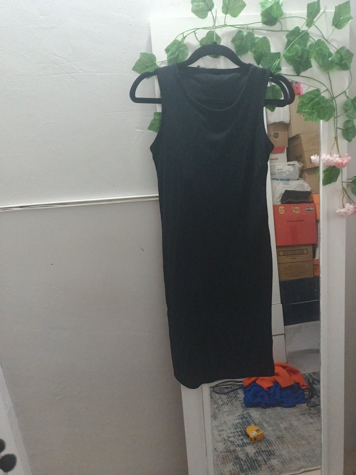 Siyah midi uzunlukta, yüksek yakalı ve kolsuz kadın triko elbise. Sentetik kumaştan, minimal ve zahmetsiz şıklık sunar, günlük kullanıma uygundur. eni 40 cm uzunluğunda boyu 90 cm. ürünüm temizdir