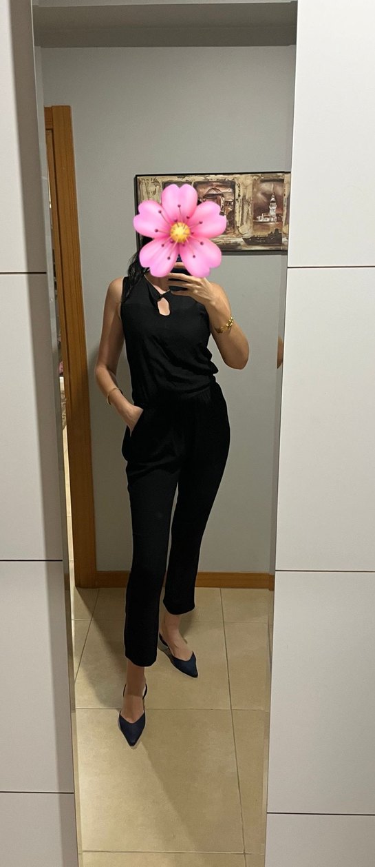 Yüksek yakalı ve kolsuz, siyah, vücuda oturan tulum. Uzun boy ve minimalist normcore tarzıyla parti için şık ve rahat bir seçenek.