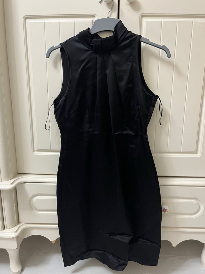 Siyah, drapeli ve yüksek yakalı, kolsuz, vücuda oturan midi elbise Adil ışık marka bir kez kullanıldı çok iyi durumda