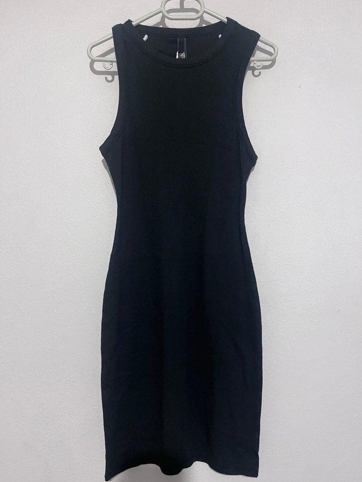 Siyah, kolsuz, yüksek yakalı ve midi boy, vücuda oturan bu elbise minimalist ve gotik tarzda, şık ve dikkat çekici bir görünüme sahip.