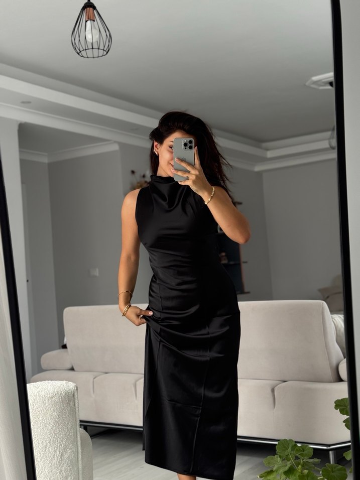 Yüksek yakalı, kolsuz ve zara model saten siyah midi elbise, ipeksi kumaştan yapılmıştır. Romantik akşamlar için uygundur. ✨