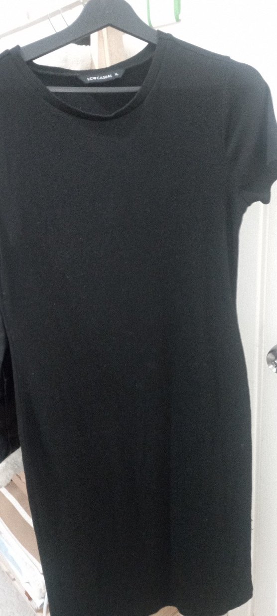 Siyah, yüksek yakalı ve kısa kollu, vücuda oturan midi elbise. Sentetik kumaştan, minimalist ve zahmetsiz şıklık sunar, ofis için uygun.