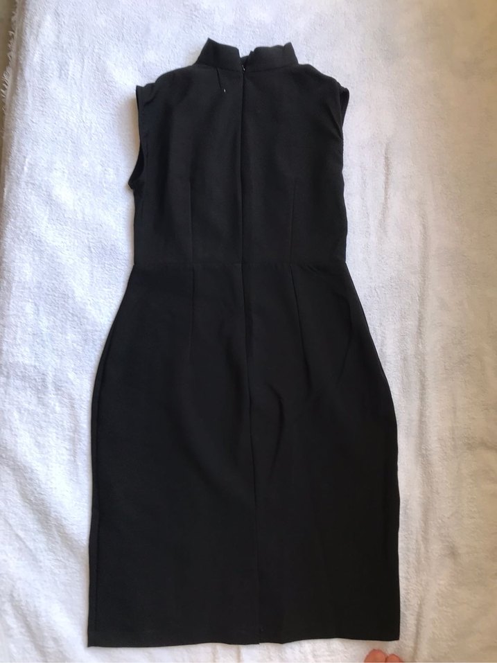 Siyah, yüksek yakalı, fermuarlı arka detaylı, vücuda oturan midi elbise, minimalist gotik tarzda, ofis için uygun. 1 kere giyilmiştir tekliflerinize açığım