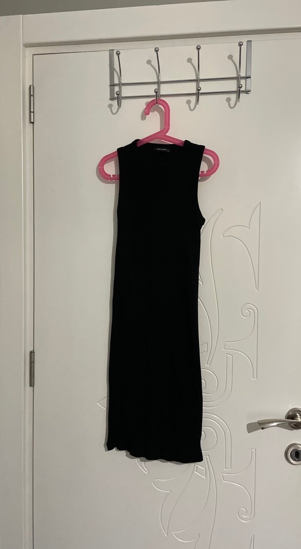 Düz siyah, yüksek yakalı ve kollu olmayan bu elbise, şık ve sade tasarımıyla günlük kullanıma uygundur.