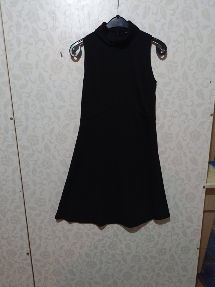 Yüksek yakalı, kolsuz ve siyah midi boyda, oturan kesimli bu elbise gotik tarzıyla zahmetsiz şıklık sunar. Günlük kullanıma uygundur.