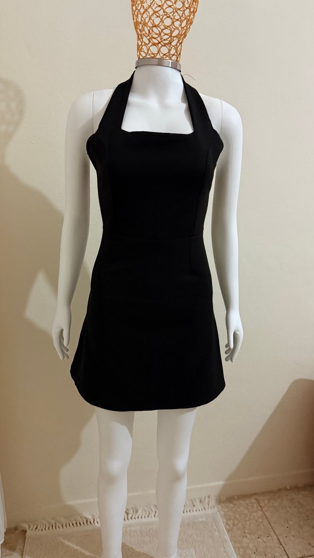 Yüksek yakalı, kolsuz, siyah midi boy, vücuda oturan elbise. Minimalist gotik tarzıyla romantik akşamlar için şık ve sade bir seçim.