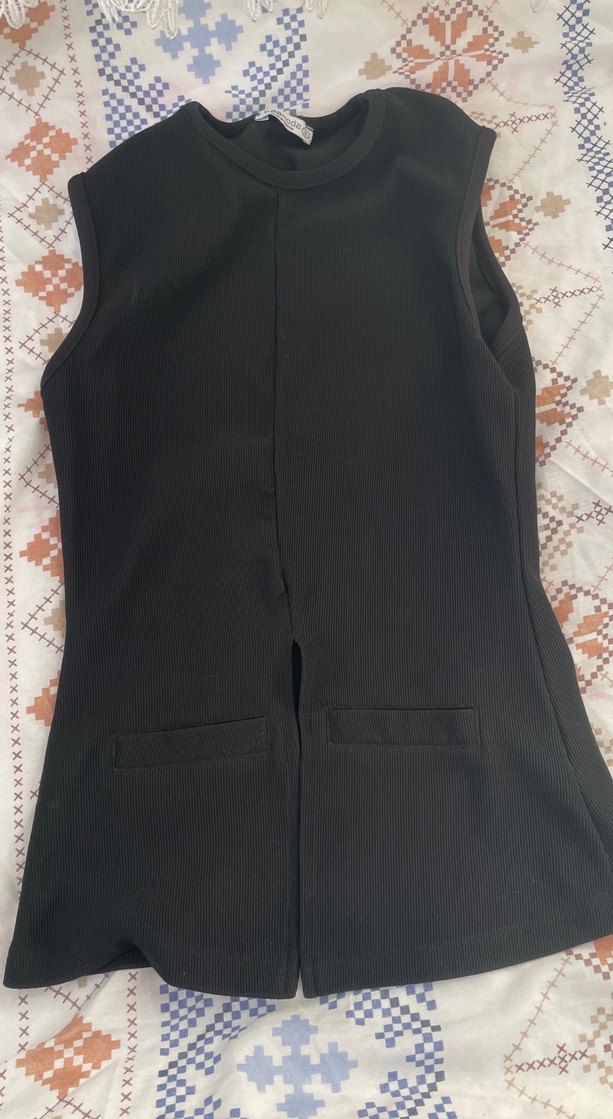 Düz siyah, yüksek yakalı ve önden yırtmaçlı, vücuda oturan kolsuz bluz. Pürüzsüz sentetik kumaştan, minimalist sokak stili için uygun.