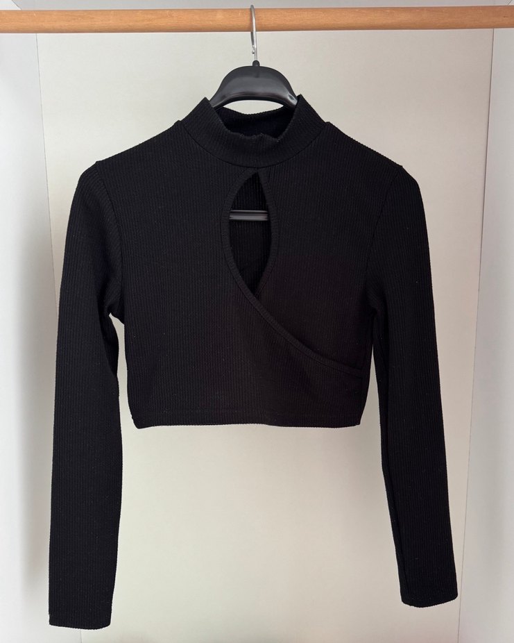 Siyah, yüksek yakalı ve uzun kollu, yumuşak ve sıcak kumaştan mini uzunlukta, yırtmaç detaylı, minimalist gotik tarzda dar kesim bluz.