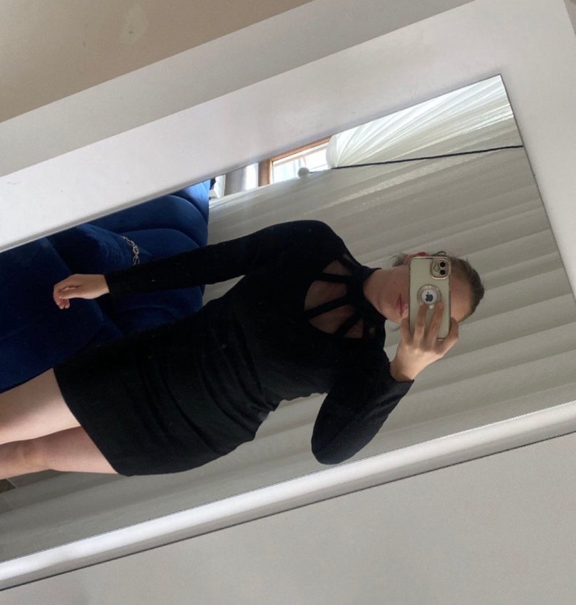 Siyah süet kumaştan, yüksek yakalı, askılı kollu ve yırtmaçlı mini elbise. Gotik tarzda, midi boyda, cesur bir görünüm sunar.