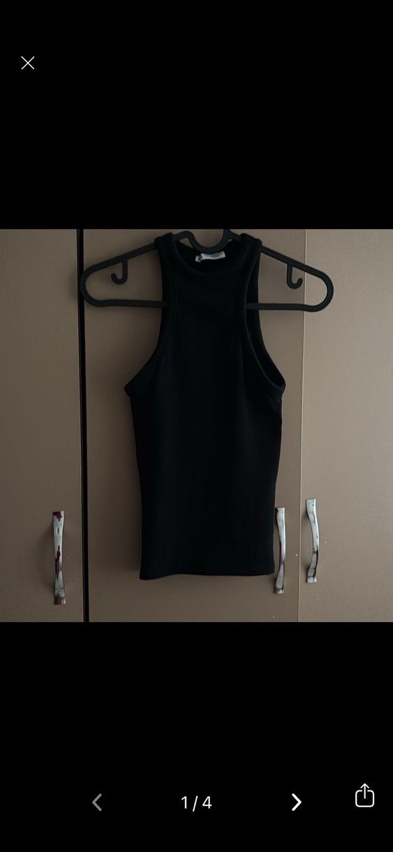 Siyah, yüksek yakalı, kolsuz, kısa kesim ve vücuda oturan kadın atlet. Düz, şık ve sentetik kumaştan yapılmıştır.