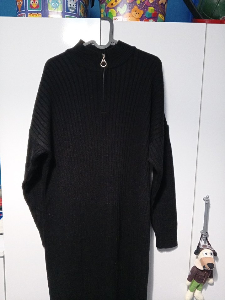 Bu siyah örgü elbise yüksek yakalı ve uzun kolludur, bol kesimiyle rahat ve trend bir goth tarzı sunar. bir kere girildi çok şık duruyor