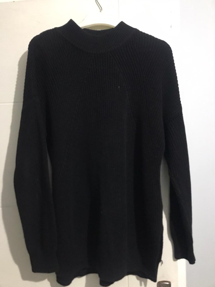 Siyah renkli, yüksek yakalı, uzun kollu örgü kadın kazak. Salaş kesimi ve midi boyuyla günlük kullanıma uygun, rahat ve gotik tarzda.