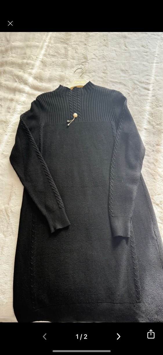 Siyah renkte, yüksek yakalı, uzun kollu ve örgü dokulu kadın kazak. Rahat kesimi ve uzun boyu günlük kullanıma uygundur.