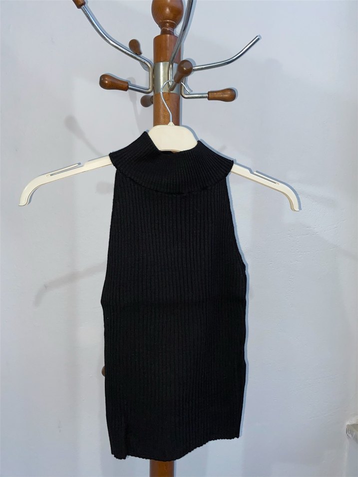 Yüksek yakalı, kolsuz, siyah örgü kadın süveter. Mini kısa boy ve rahat sokak stili ile günlük kullanıma uygundur. S/M/L mevcuttur.