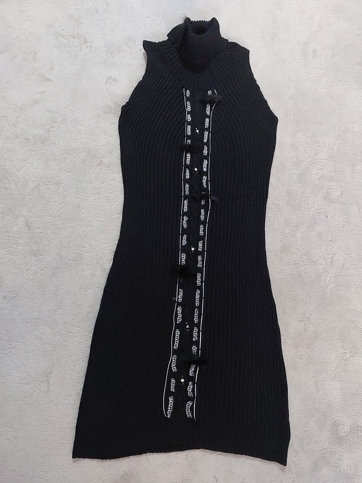 Yüksek yakalı, kolsuz ve vücudun şeklini alan kendinden simli örgü elbise, önünde nakış detaylarıyla gotik ve rahat tarzı birleştirir. Günlük kullanıma uygundur.