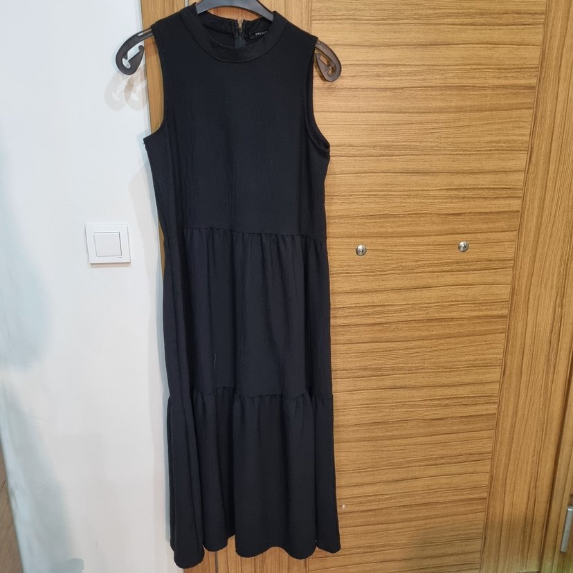 Siyah, yüksek yakalı, kolsuz uzun elbise. Pileli tasarımı ve bol kesimiyle sentetik kumaştan üretilmiştir. Rahat ve minimalist stil için uygundur. iki defa birer saat kullanıldı