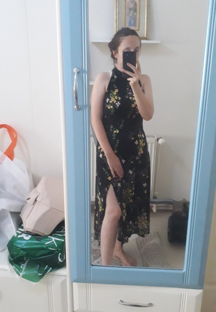 Yüksek yakalı ve kolsuz, transparan ipeksi kumaştan yapılmış siyah, bağlama desenli, vücuda oturan midi elbise. Romantik akşamlar için uygundur. esnek yapısı var m beden ama l xl de giyebilir